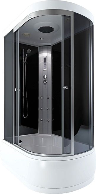 поддон высокий 50см фронтальные стекла серые тонированные задние стекла черные центральная панель пластик «серебро» хромированный алюминиевый профиль регулируемые ролики хромированные ручки для дверей 3-х режимный смеситель ручная лейка на штанге 6 гидромассажных форсунок верхняя лейка «тропический душ» стеклянная полка