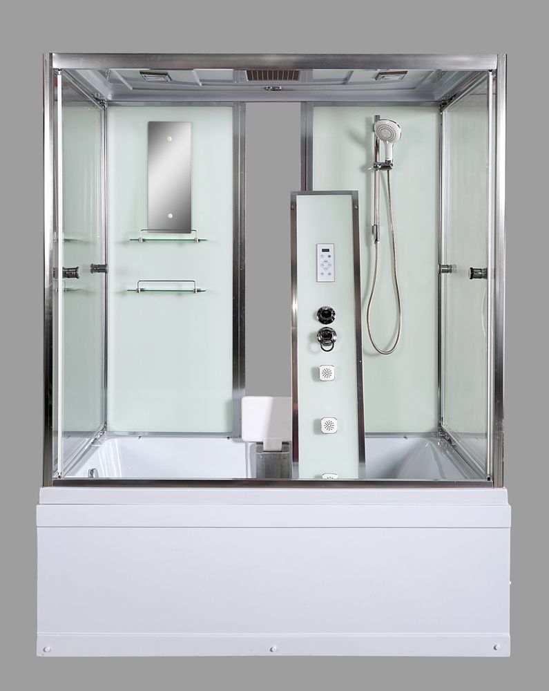 Стильная душевая кабина с внутренней сборкой AvaCan V160 сочетает в себе высокую функциональность, практичность и надежность. Для изготовления применяют безопасное закаленное стекло толщиной 5 мм, надежно фиксируемое алюминиевым профилем. Цвет профиля хром. В комплекте зеркало, сенсорный пульт управления, передний съемный экран, донный клапан (клик-клак), душевой гарнитур, тропический (верхний) душ, откидное сиденье, гидромассажные форсунки, смеситель, переключатель режимов, вентиляция, радио.