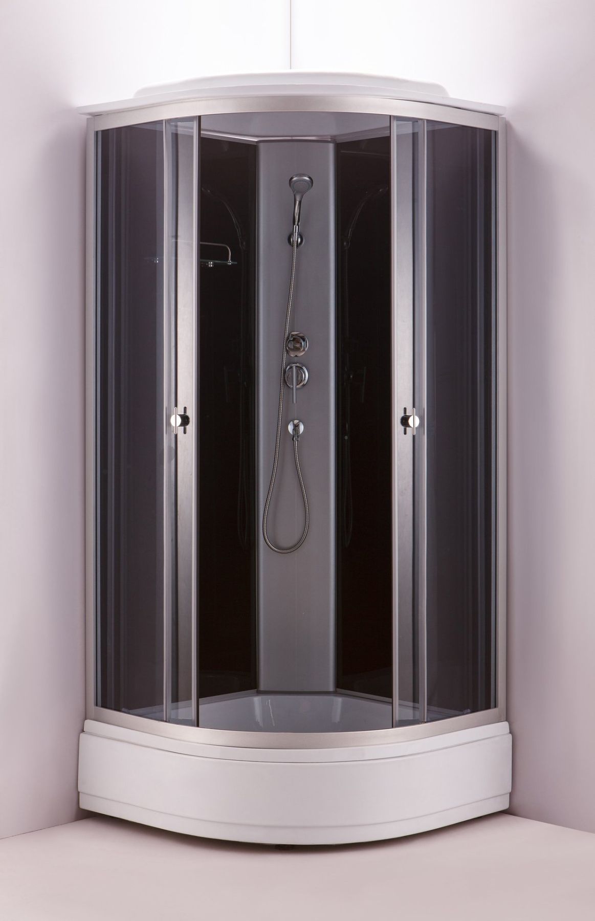 Поддон акриловый средний 26см(без сиденья на поддоне),глубина 13 см,сифон с гофрой,экран съемный, профиль матовый хром, центральная панель серебро, задние стенки закаленные, черные,крашенные,передние стекла закаленные,тонированные, смеситель 2-х режимный,тропический душ,ручной душ, полочка.