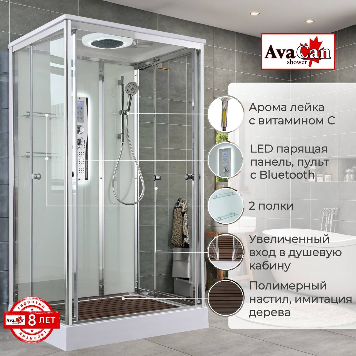 Стильная душевая кабина AvaCan сочетает в себе высокую функциональность, практичность и надежность. При изготовлении применяется безопасное закаленное стекло, надежно фиксируемое алюминиевым профилем.Профиль сделан из алюминия повышенной прочности. Сборка без силикона (увеличивает срок службы, защищает от протечек), внутренняя сборка (облегчает установку и ревизию; позволяет установить в ограниченном пространстве и обойтись без демонтажа других сантехнических приборов), смеситель резьбовой (без хомутов).Двойные металлические ролики дверей (распределение нагрузки на два ролика, увеличивают срок службы). Душевая штанга(позволяет регулировать по высоте ручную лейку), ручная арома-лейка с витамином С (картридж в комплекте,есть возможность замены или удаления картриджа), полочки(из стекла, с ограничителем), сифон с гидрозатвором, сенсорный пульт управления с функциями: блютуз, LED подсветка, радио, вытяжка, гидромассаж спины, тропический (верхний) душ.