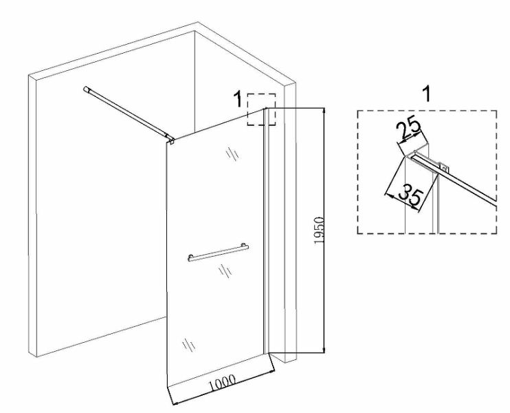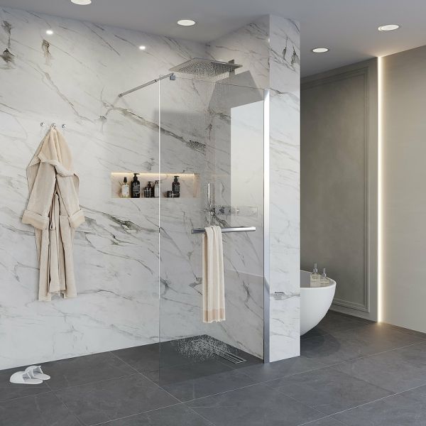 Это решение экономит место в ванной комнате. Также с помощью неподвижной стенки можно, например, отгородить стиральную машину, шкаф, раковину или унитаз.