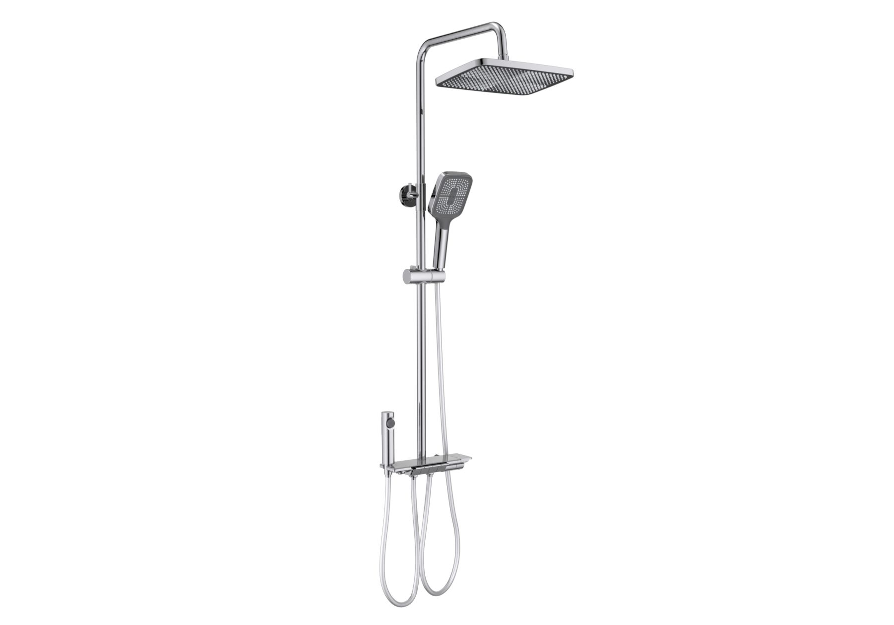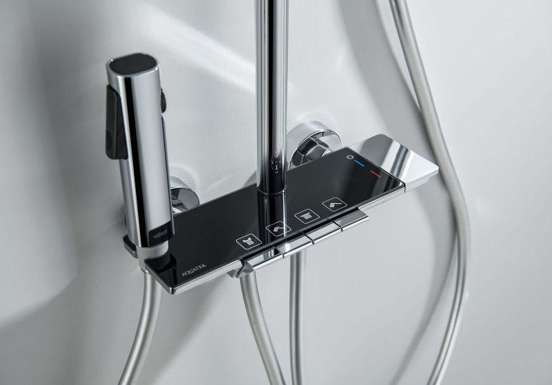 Одной из ключевых особенностей является скрытый излив, который придает системе современный и минималистичный вид, освобождая пространство и создавая ощущение легкости. Регулируемая душевая штанга из нержавеющей стали выдвигается до 1340 мм в высоту, что позволяет легко настроить ее под индивидуальные предпочтения каждого пользователя.