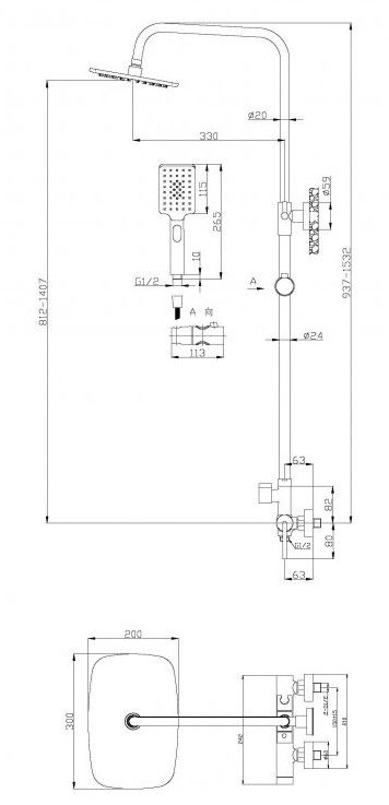 Дополнительная информация: регулируемая высота верхнего душа