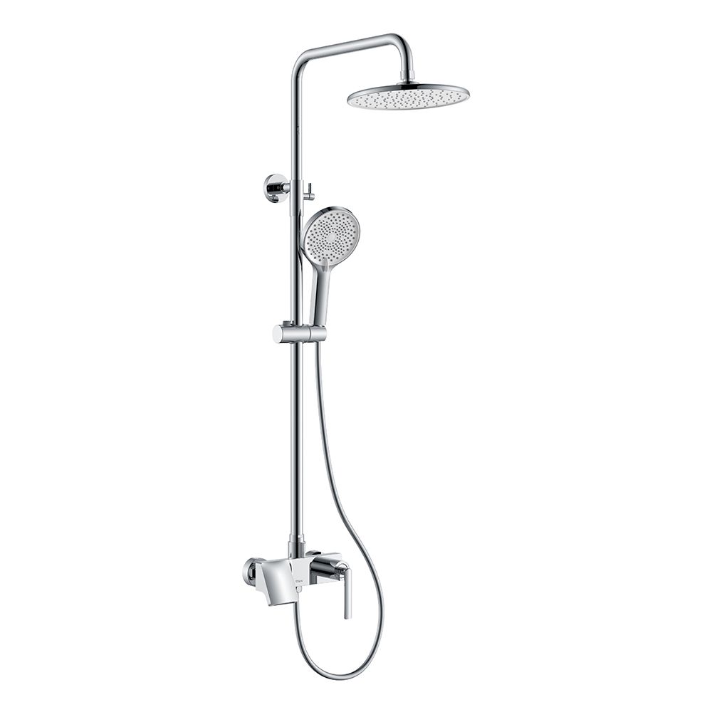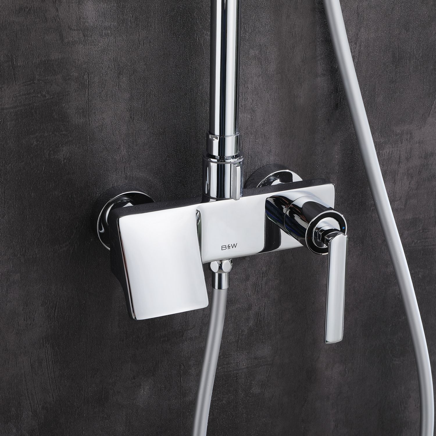 Душевая стойка в цвете глянцевый хром датского производителя Black&White. Корпус изделия произведен из сантехнической латуни – безопасного и коррозиестойкого сплава.Управление потоками и температурой воды выполняет керамический картридж повышенной пропускной способности.  Из потребителей на комплекте установлен верхний душ, ручной душ, а также на верхней части корпуса под углом расположен каскадный излив для набора емкостей. Для выбора режима работы  у основания стойки расположен поворотный дивертор выполненный в виде кольца с дополнительным выступом для удобства использования мокрыми руками.