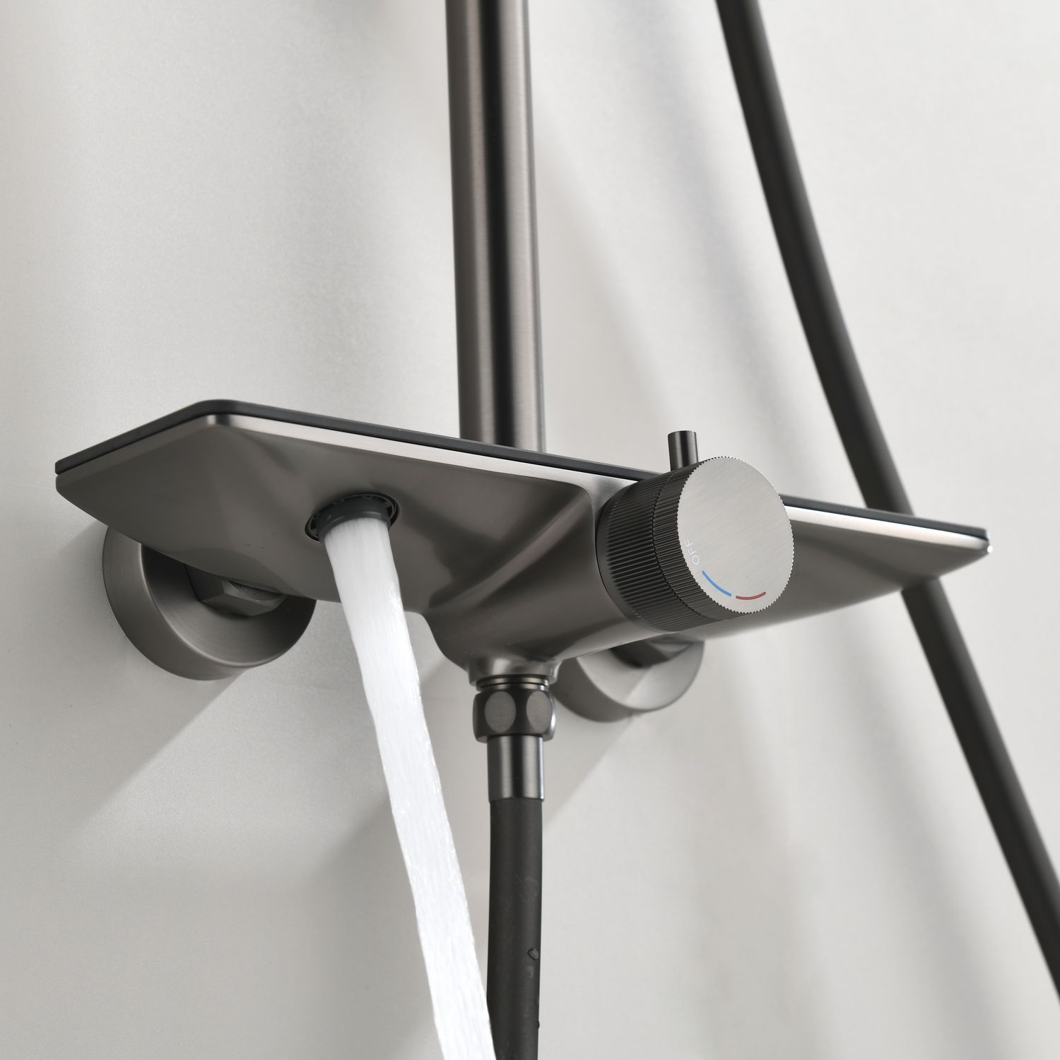 Душевая стойка от датского производителя Black&White в цвете оружейная сталь. Корпус штанги и смесителя производится из латуни марки HPB 59– безопасный для здоровья сплав, выдерживающий высокое давление воды. Для управления потоками и температурой установлен прогрессивный картридж без регулировки давления, для экономии воды, а также в данной серии переключатель режимов установлен сразу за картриджем в виде кольца c продольными насечками – нетривиальное решение, которое облегчает уборку. Верхняя крышка смесителя украшена тонированным стеклом . Из потребителей установлен верхний и ручной душ, а также излив для наполнения емкостей.