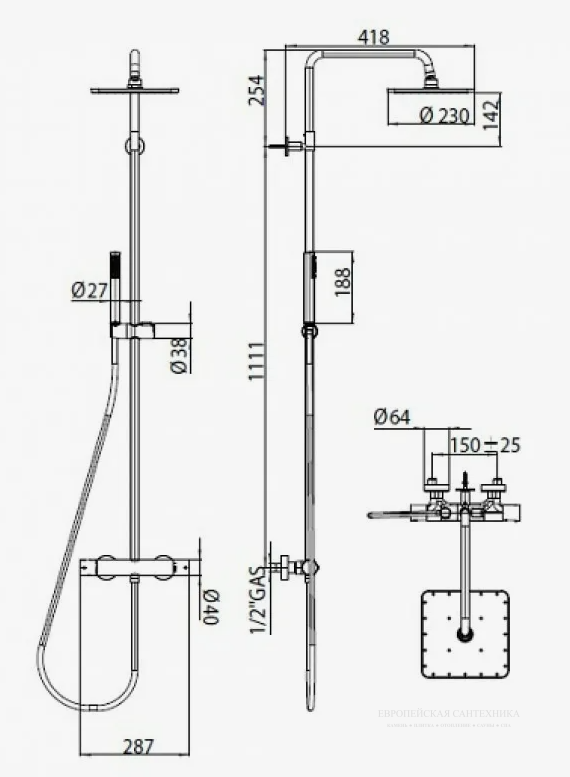 Стойка оснащена верхним душем размером 230х230 мм, который обеспечивает широкий и равномерный поток воды, создавая эффект тропического дождя. Поворотная функция позволяет легко настроить направление потока воды для максимального комфорта. Также в комплект входит ручной душ, который предоставляет дополнительные возможности для гибкости и удобства использования.