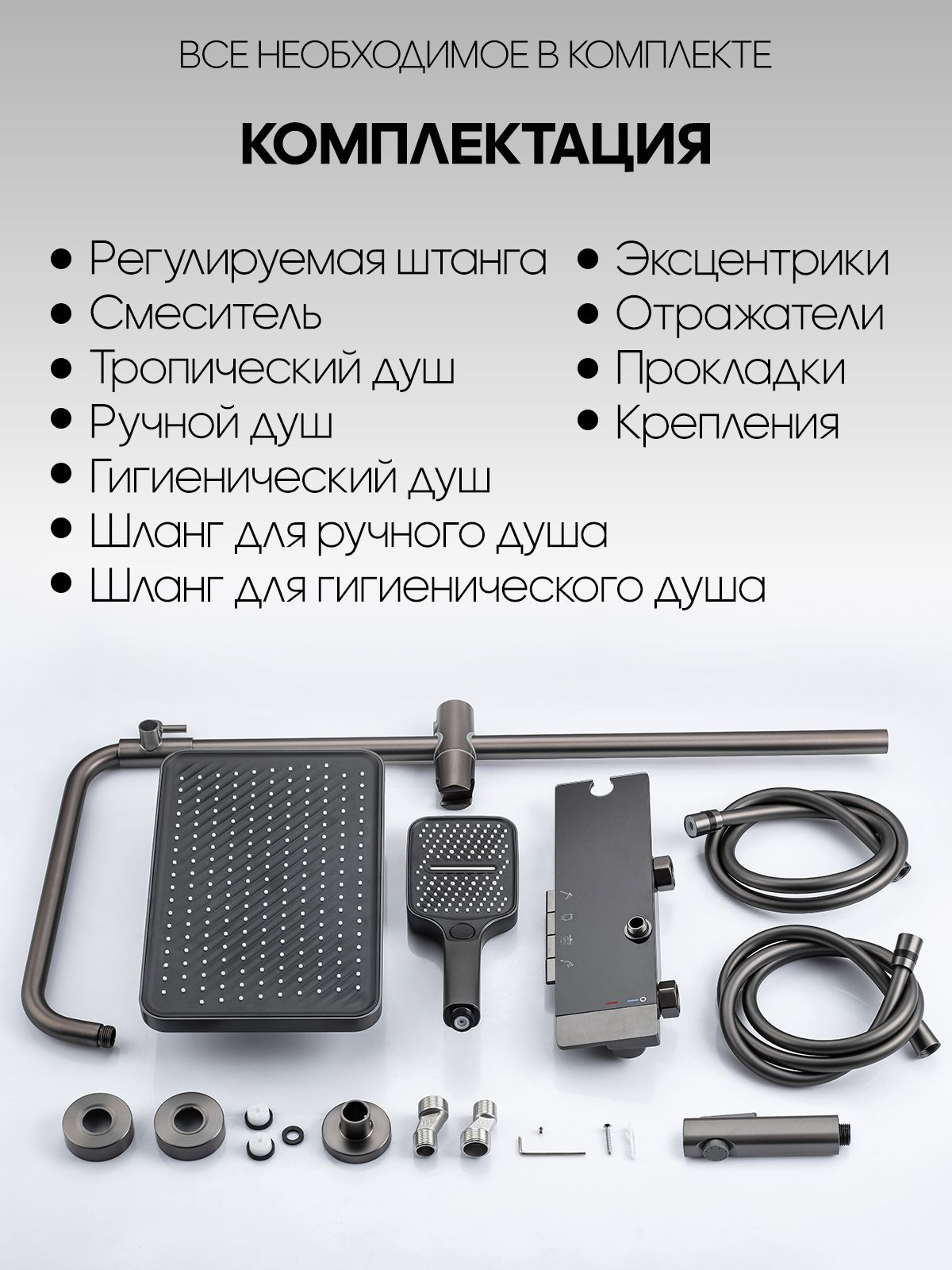 Душевой комплект содержит все необходимое для монтажа. Кроме того, наша душевая стойка с дисплеем и подсветкой имеет простой и быстрый монтаж, благодаря чему вы сможете установить ее самостоятельно без привлечения специалистов. Это позволит сэкономить время и деньги, а также получить удовольствие от процесса создания своего уютного уголка в ванной комнате.