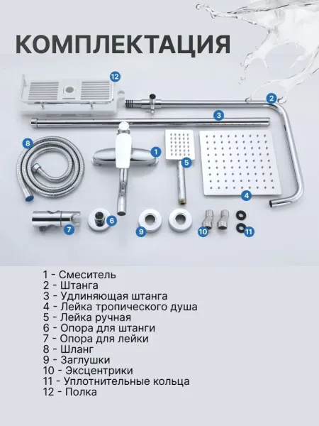Душевой гарнитур содержит все необходимое для монтажа. Кроме того, наша душевая стойка хром имеет простой и быстрый монтаж, благодаря чему вы сможете установить ее самостоятельно без привлечения специалистов. Это позволит сэкономить время и деньги, а также получить удовольствие от процесса создания своего уютного уголка в ванной комнате.