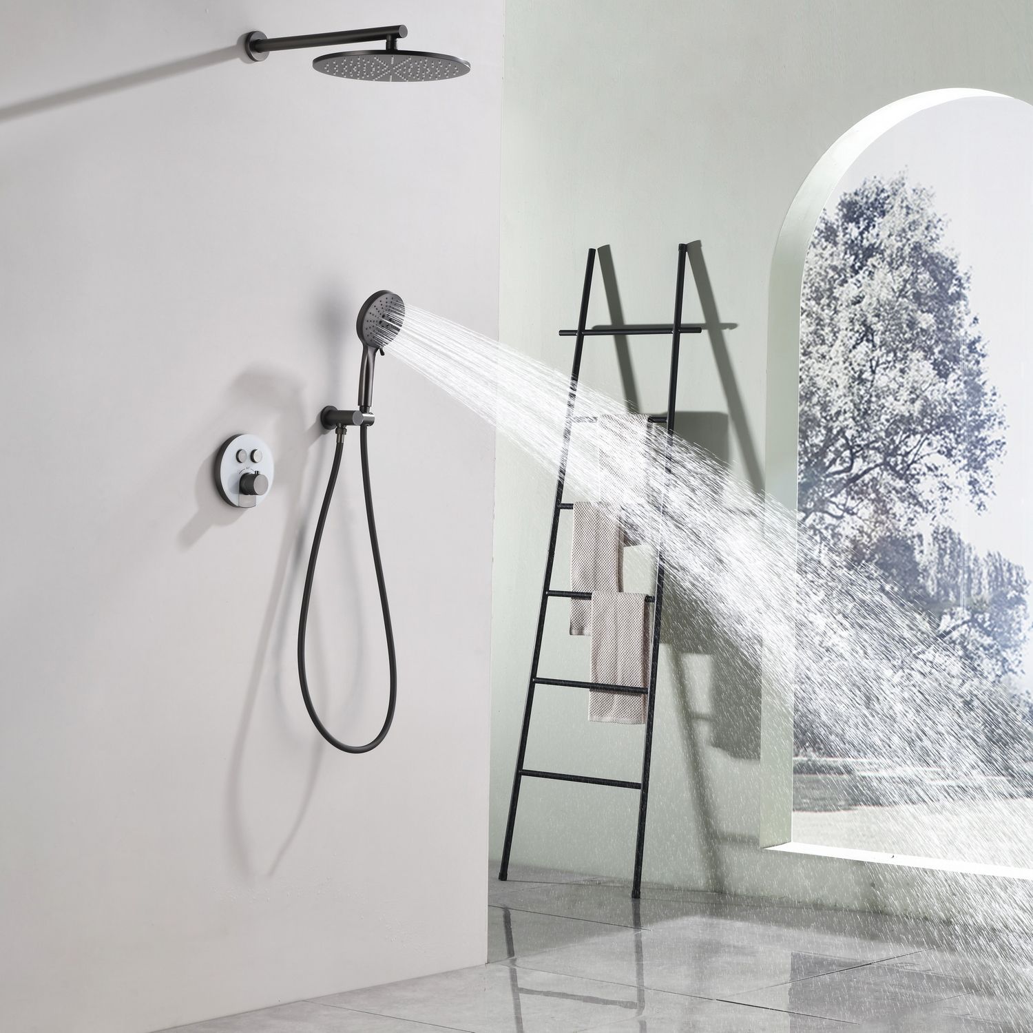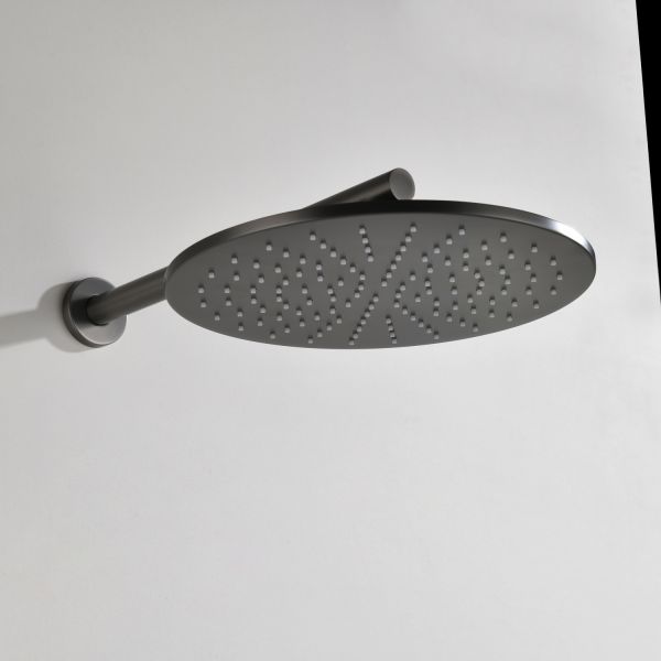 Комплект скрытого монтажа для душа датского производителя Black&White в цвете оружейная сталь. Корпус изделия выполнен в форме диска, в который интегрирован термостатический картридж прогрессивного типа для настройки температуры с постоянным давлением, а также кнопочный дивертор для выбора нужного потребителя. В комплектацию входит верхний душ на кронштейне цилиндрической формы и ручная лейка с режимами. Скрытая часть также входит в комплектацию данного изделия.