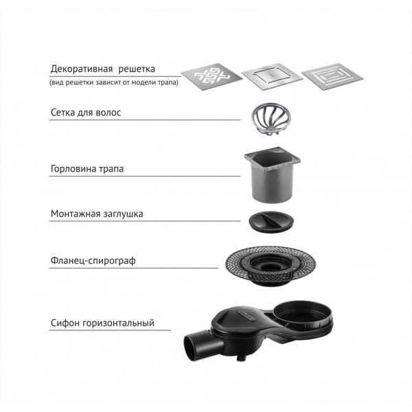 Решетка под плитку, нержавеющая сталь AISI 304Горловина трапа, пластикФланец трапа с переходником, РРМонтажная заглушка, PPСамопромывной S-образный сифон PP:горизонтальный выпуск D50 H60, пропускная способность 42л/мин, монтаж 360°Монтажный ключ, пластик