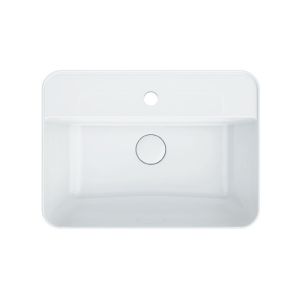Белая глянцевая подвесная раковина с отверстием под смеситель и крепежом, ширина 55 см. Донный клапан в комплект не входит, рекомендуем донный клапан . Донный клапан конструктивно не закрывается полностью, так как у раковины отсутствует отверстие слив-перелив.
