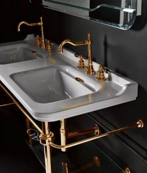 Консоль для раковины Kerasan Waldorf 9195K3br бронзаKerasan Waldorf 9195K3 Консоль для раковины на 150 см. Металлическая структура для раковины 150 см, со стеклянной полочкой, цвет бронза (из 2-х коробок: арт. 919593+920293 и 919801). Подходит к 4143K1 раковина керамическая двойная 150х55 см, c 1 отверстием под смеситель на чашу, белая.