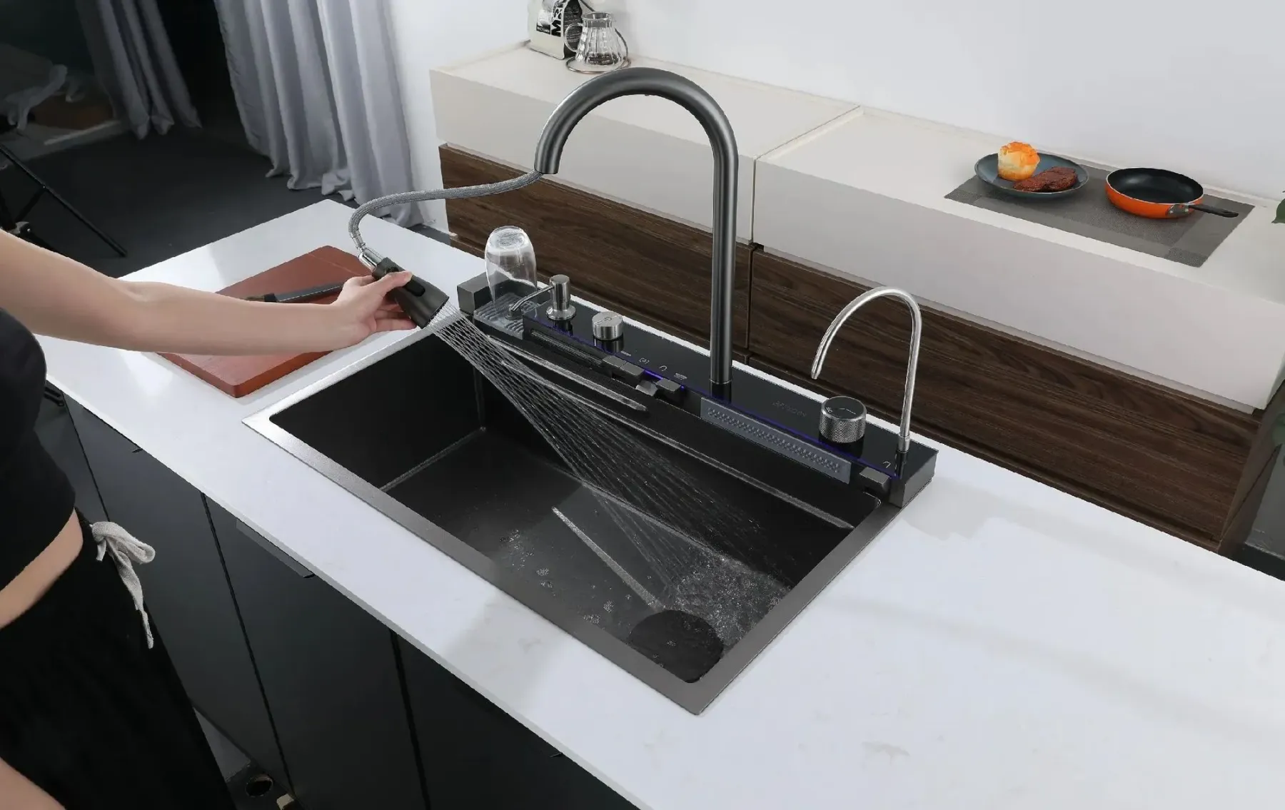 Клавишная панель переключения режимов – позволяет простым нажатием на клавишу выбрать нужный режим: каскадный водопад/ смеситель/ водопад/ мойка чашек.