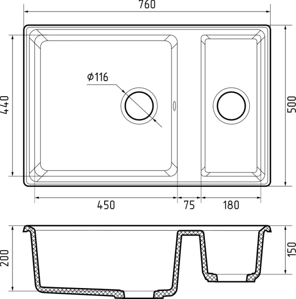 Размер чаши 2: 180 х 440 х 150 мм