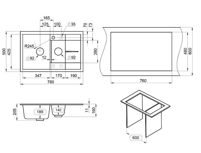 Мойка кухонная Granula 7802, ГРАФИТ