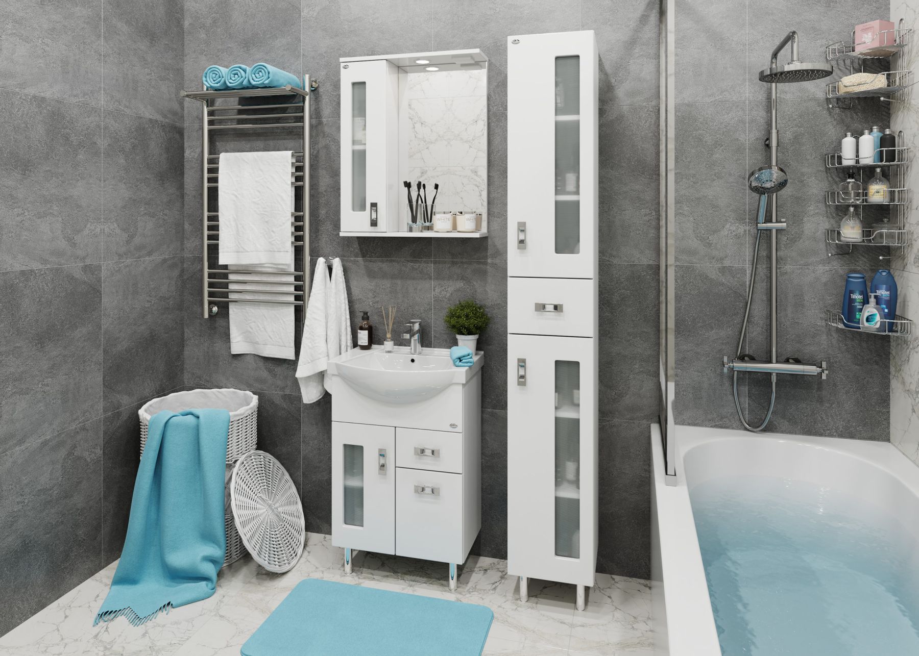 Корпус пенала выполнен из ЛДСП, фасад - из МДФ в пленке, специально предназначенных для использования в условиях высокой влажности.