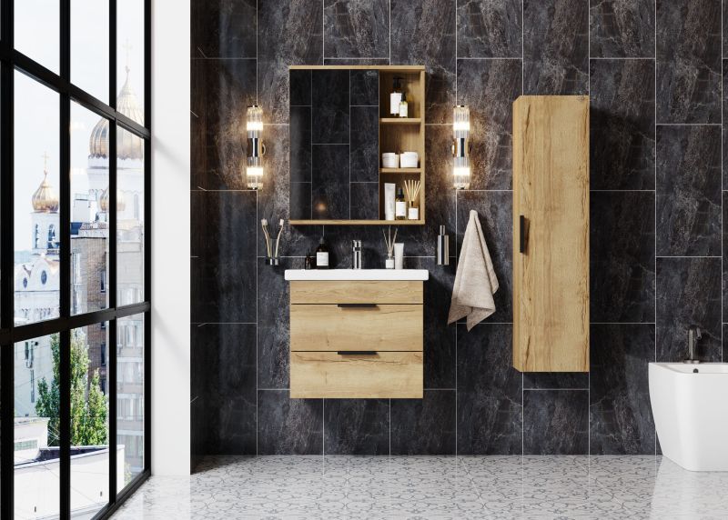 Подвесной пенал для ванной комнаты Onika ЛЕГРАН 30 - это сочетание насыщенного древесного декора и благородства металла: роскошная текстура и натуральный цвет дуб галифакс дают теплоту, а матовая металлическая ручка добавляет урбанизма и солидности.