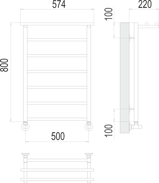 Модель "Контур с полкой" относится к линейке в стиле хай-тек, тяготеющей к лаконичным формам и хромированным поверхностям, и отличается наличием дополнительной прогреваемой полки для хранения и сушки полотенец.