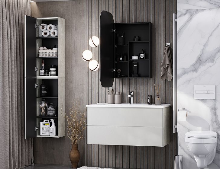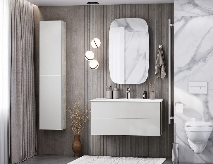 Дополняет коллекцию предметов мебели Сохо шкафчик в созвучном дизайне: боковые стенки ЛВДСП, фасад –плита МДФ в пленке с покрытием soft touch. За фасадом – створкой, открывающимся с помощью push-to-open, находятся регулируемые по высоте полочки.