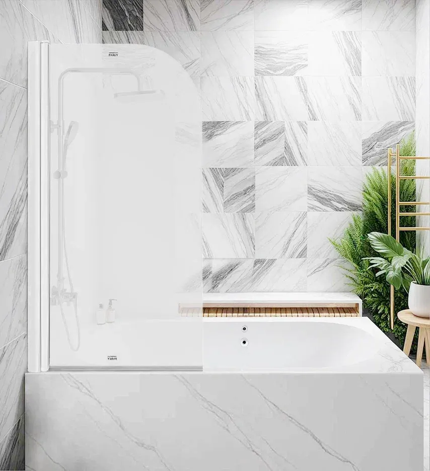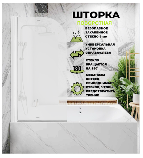 Штора изготовлена из безопасного закалённого стекла, толщиной 5 мм. Оно обработано против известкового налета, поэтому гигиенично и требует минимум усилий для его очистки, в отличие от занавесок для душа. Штора для ванны станет барьером между ванной и полом и предотвратит разбрызгивание воды.