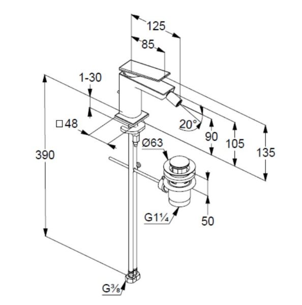 Однорычажный смеситель для биде Kludi Decus: монтаж на одно отверстие, литой рычаг, аэратор M 16 x 1, керамический картридж с ограничителем горячей воды, расход воды 5 л/мин при давлении 3 бара, гибкая подводка G 3/8 с сертификатом DVGW, система быстрого монтажа, донный клапан G 1 1/4 из металла.