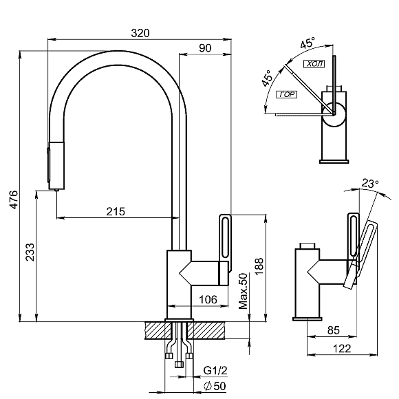 • Высота смесителя: