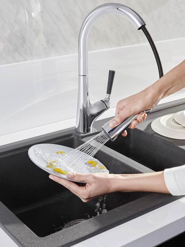 Смеситель для кухни Jacob Delafon MALLECO E562-CP.Подберите смеситель под стиль вашей кухни, просто изменив цвет ручки, легко и без инструментов. В комплект входят 3 съемные силиконовые накладки черного, белого и серого цвета.Технология ProMotion обеспечивает легкость в использовании благодаря установленному на шарнире вытяжному изливу, который надежно фиксируется магнитным механизмом DockNetik.Простая замена шланга излива продлевает эксплуатацию смесителя без необходимости его замены.Смеситель Malleco имеет 2 режима подачи воды: аэрированный поток для эффективной очистки и насыщенный напор для быстрого наполнения емкости. Простое переключение между режимами делает использование смесителя по-настоящему комфортным.