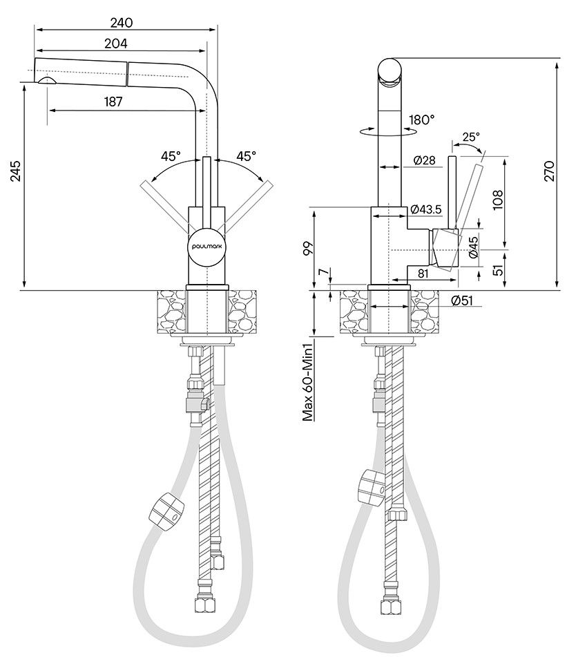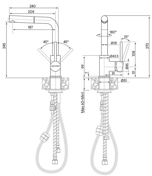 Смеситель для кухни с выдвижным шлангом, Ka214311-401.Изготовлен из высококачественной латуни, которая отвечает высочайшим европейским стандартам качества, не содержит свинца, не разрушается со временем и безопасна для здоровья.Вытяжной шланг