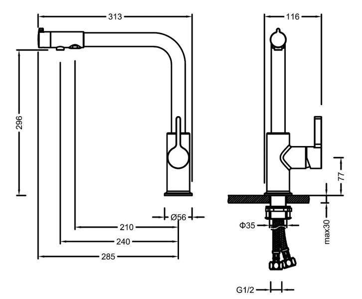 Смеситель Timo Hette 1026 с функцией подключения фильтра для питьевой воды предназначен для монтажа на кухонную мойку или столешницу. Высокий излив подходит для моек с двумя чашами, а также позволяет справляться с мытьем габаритной посуды. В нижней части смесителя установлена трубка с адаптером для соединения с трубкой фильтра. Подача фильтрованной воды осуществляется поворотом ручки дивертора, расположенной на изливе смесителя.