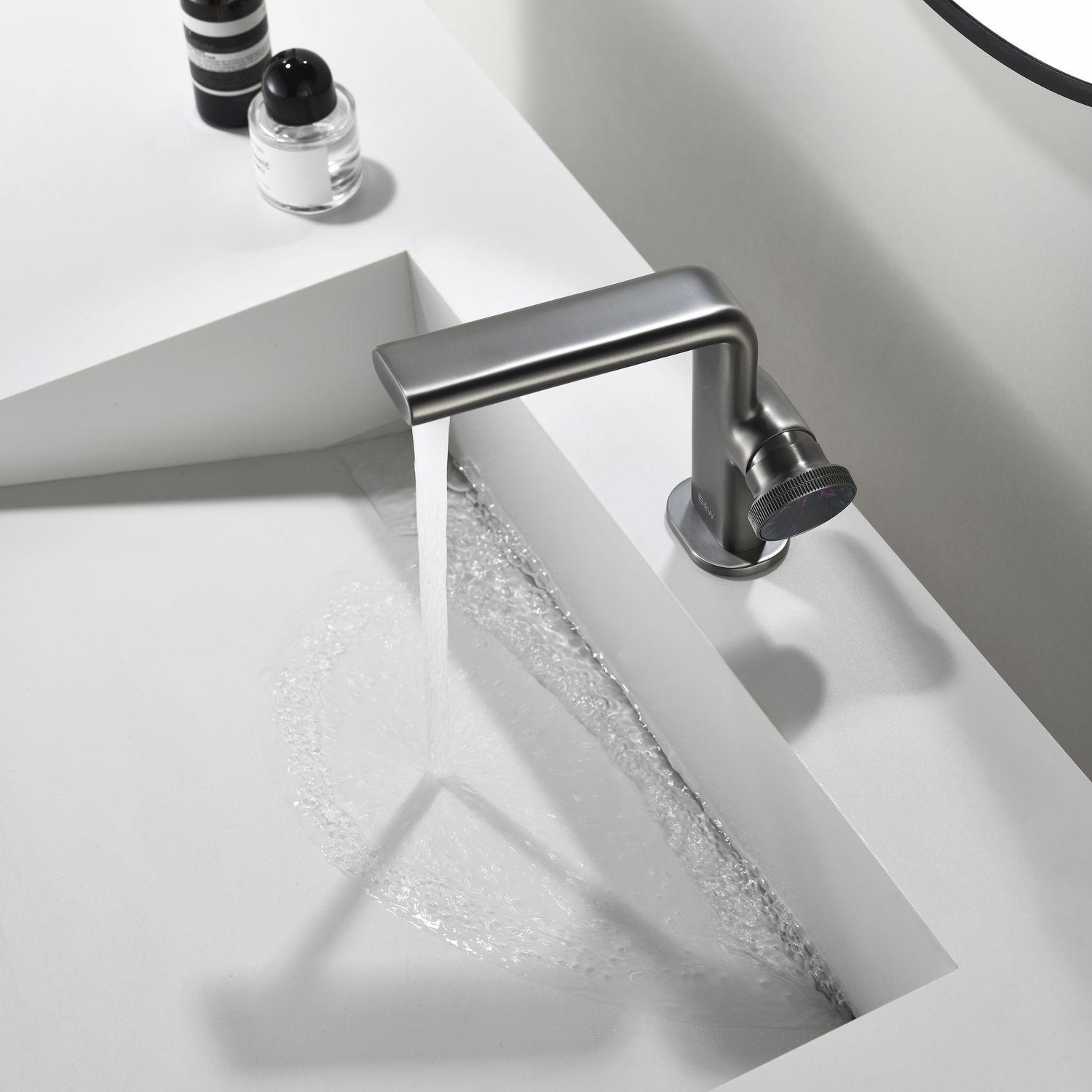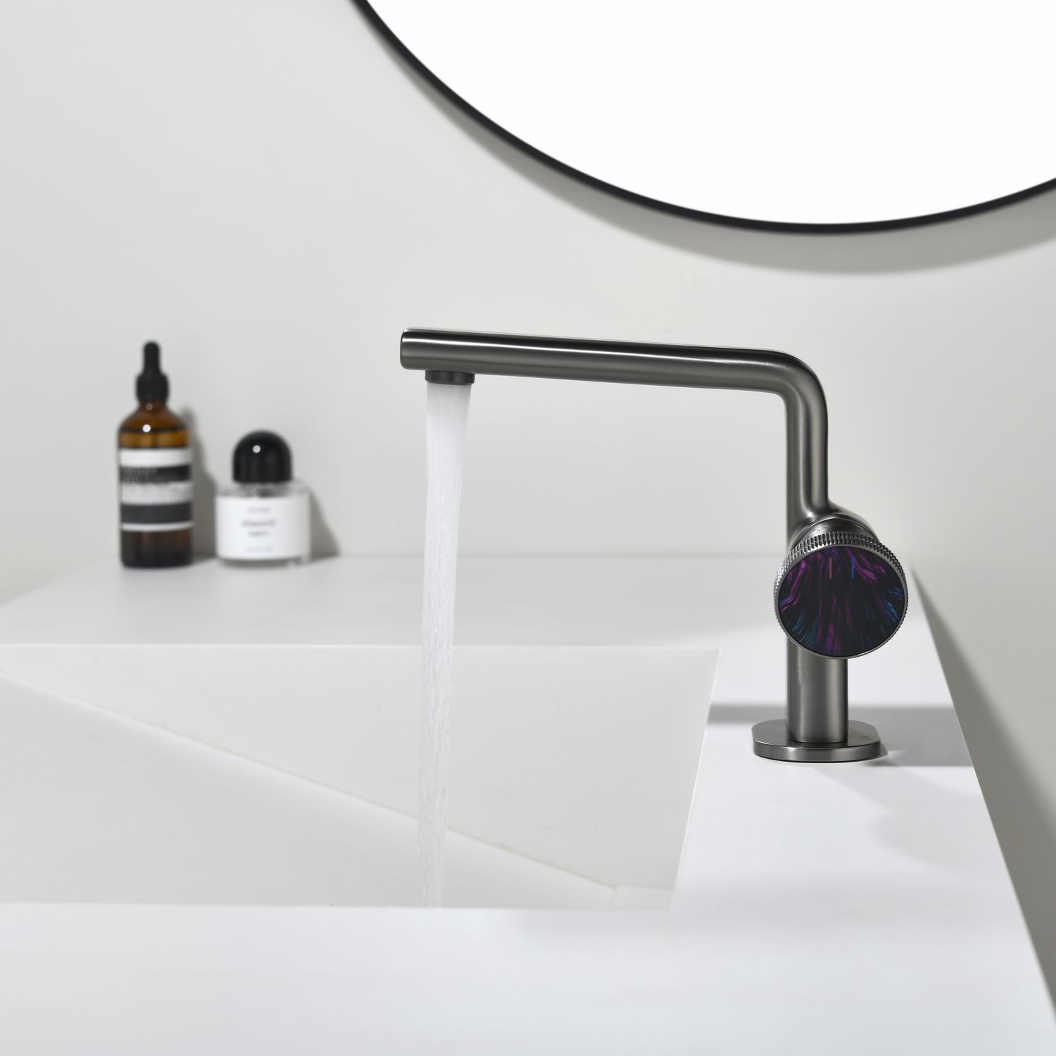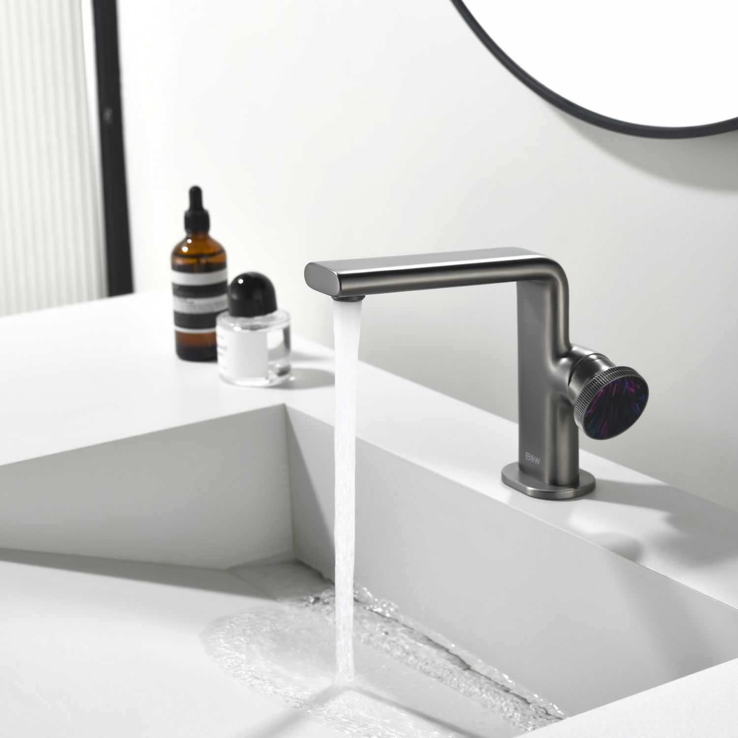 Смеситель для раковины датского производителя Black&White в цвете оружейная сталь. Корпус изготовлен из сантехнической латуни марки HPB 53– безопасного для здоровья сплава из олова цинка и  меди. На изделии установлен картридж прогрессивной конфигурации, без возможности регулировки давления в полном диапазоне, доступна регулировка температуры для удобства настройки и экономии воды. Для включения используется ручка в форме диска  с насечками и ярким цветовым дополнением.В дизайне продукта используются лаконичные прямоугольные формы со скруглением, которые гармонично дополнят многие современные интерьеры ванных комнат.
