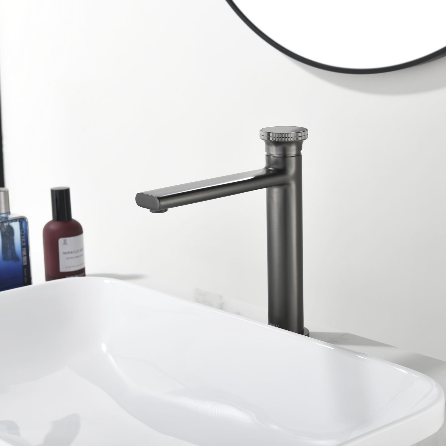 Смеситель для накладной раковины датского производителя Black&White в цвете оружейная сталь. Материал корпуса – сантехническая латунь марки HPB 59,безопасный для здоровья и высокоресурсный сплав.Для  настройки температуры  установлен керамический картридж прогрессивного типа– давление выдается постоянным , а температура выставляется с помощью круглой ручки с насечками расположенной сверху корпуса. В изделии пересекаются цилиндрические и прямоугольные формы, которые гармонично вольются в современные интерьеры ванных комнат.