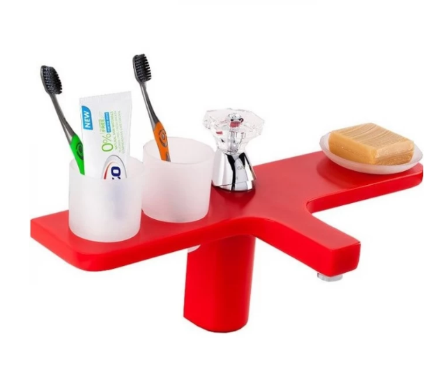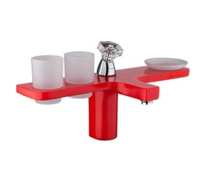 Смеситель для умывальника Gappo Giron G1096-7 — оригинальная однорычажная модель в комплекте с аксессуарами. Корпус выполнен в виде полочки, рычаг управления в форме кристалла расположен по центру. Модель изготовлена из латуни и кварцевого камня. В комплекте аксессуары для ванной комнаты: два стакана и мыльница. Цвет смесителя — красный.