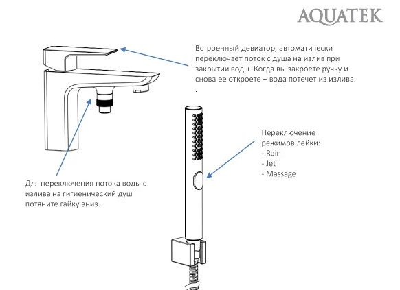 Дивертор: встроенный, автоматически переключает поток с душа на излив при закрытии воды; ручной душ включается опусканием вниз гайки у основания шланга в месте соединения с изливом