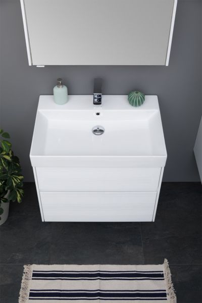 Тумба Aquanet Бруклин 60 белого цвета предназначена для подвесной установки Изделие отвечает тенденциям минимализма Аскетизм четких линий и обтекаемых форм в ней доведен до совершенства В модели нет никаких выделяющихся деталей, и даже ручки интегрированные, когда открывание происходит за счет выступающей детали верхней или нижней части фасада, которая срезана под углом, в результате чего образуется выемка, служащая ручкой В тумбе ручка устроена таким образом у верхнего ящика в нижней части фасада, а у нижнего – в верхней Такое простое решение добавляет изысканности внешнему виду изделия Раковина из керамики с тонкими изящными бортиками идет размер в размер с тумбой, ширина которой 60 см, в результате чего все изделие выглядит как единое целое Корпус изделия выполнен из выкрашенного белой краской влагостойкого ЛДСП, фасады – из МДФ На контрасте с белизной внешних деталей стильно смотрится корпус выдвижных ящиков, выполненный в цвете «дуб сонома» Нижний ящик тумбы имеет большую зону хранения, верхний разделен на несколько отделений, которые помогут грамотно разложить все необходимое по своим местам Тумба предлагается без раковины