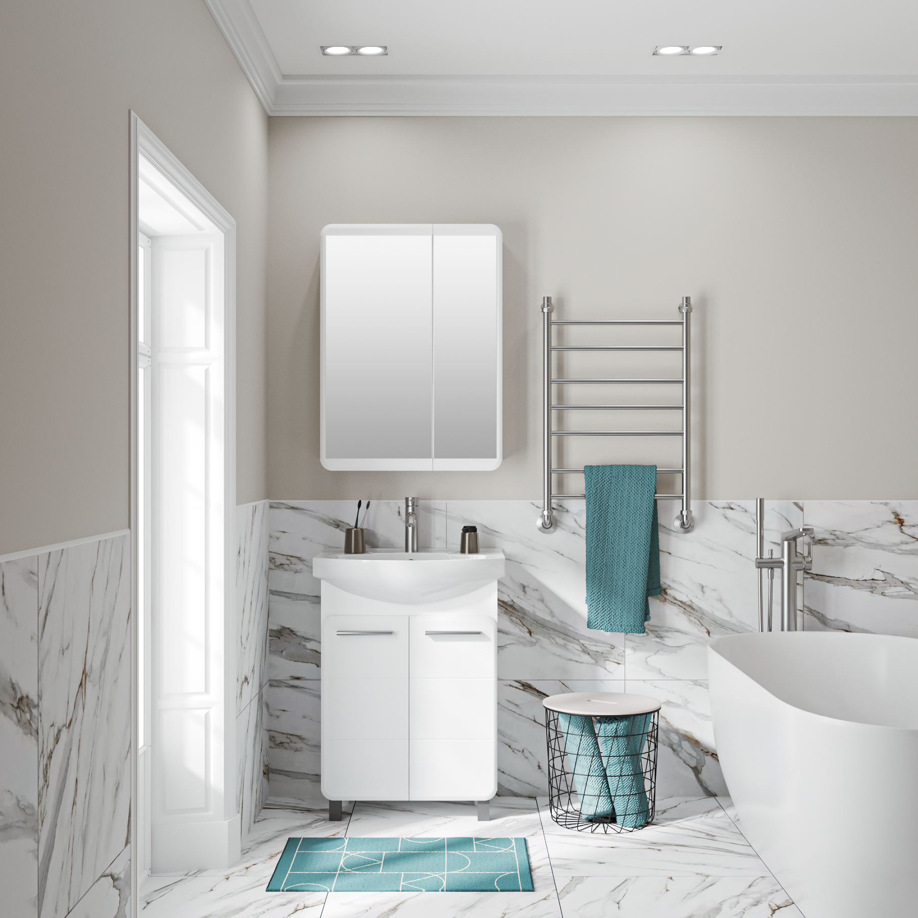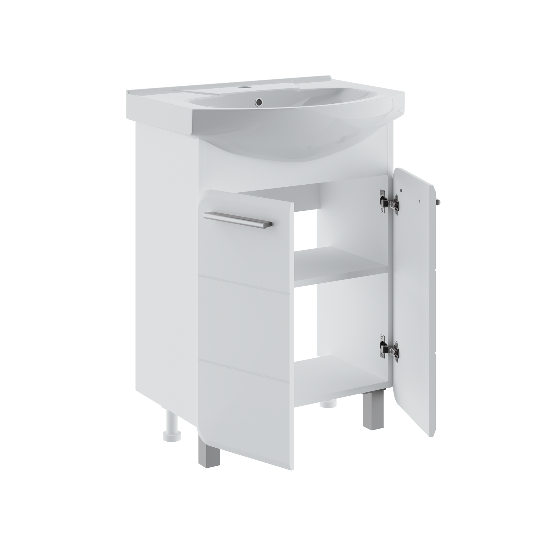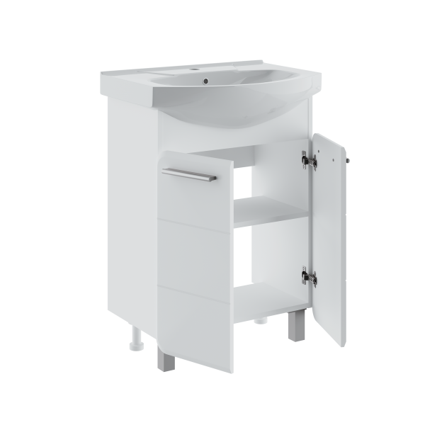 Тумба под раковину ЭРИКА - современный и стильный дизайн в оформлении ванной комнаты. Тумба под раковину ЭРИКА (напольная), выполненная в белом цвете с глянцевым покрытием, инкрустированная квадратной фрезеровкой на фасадах, превосходно украсит любой интерьер ванной комнаты. Тумба в ванную комнату имеет две распашные дверцы и одну встроенную полку. В комплекте к тумбе идут 2 ручки, петли со встроенным доводчиком, 2 хромированные и 2 пластиковые ножки. Мебель для ванной RUNO - красота и практичность в мелочах!