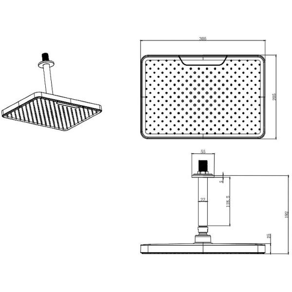Размер верхнего душа (ШхД): 305х205 мм.