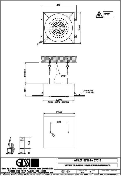 Потолочная душевая система (внутренняя часть). Встраиваемая в потолок душевая система Ø350 с функциями: тропический ливень и хромотерапия. Комплектуется пультом управления с держателем. Требуется источник питания на 12 В. Приобретается опционально блок питания арт. 57099. Артикул необходимо доукомплектовать панелью 57018 в желаемой отделке.