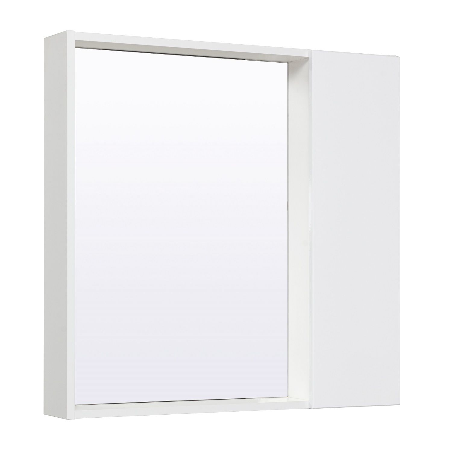 Зеркальный шкаф без подсветки и с открытой нижней полкой. Справа или слева (зависит от установки) шкафчик с распашным фасадом, за которым две внутренние полки. Петли со встроенным доводчиком. Универсальный.